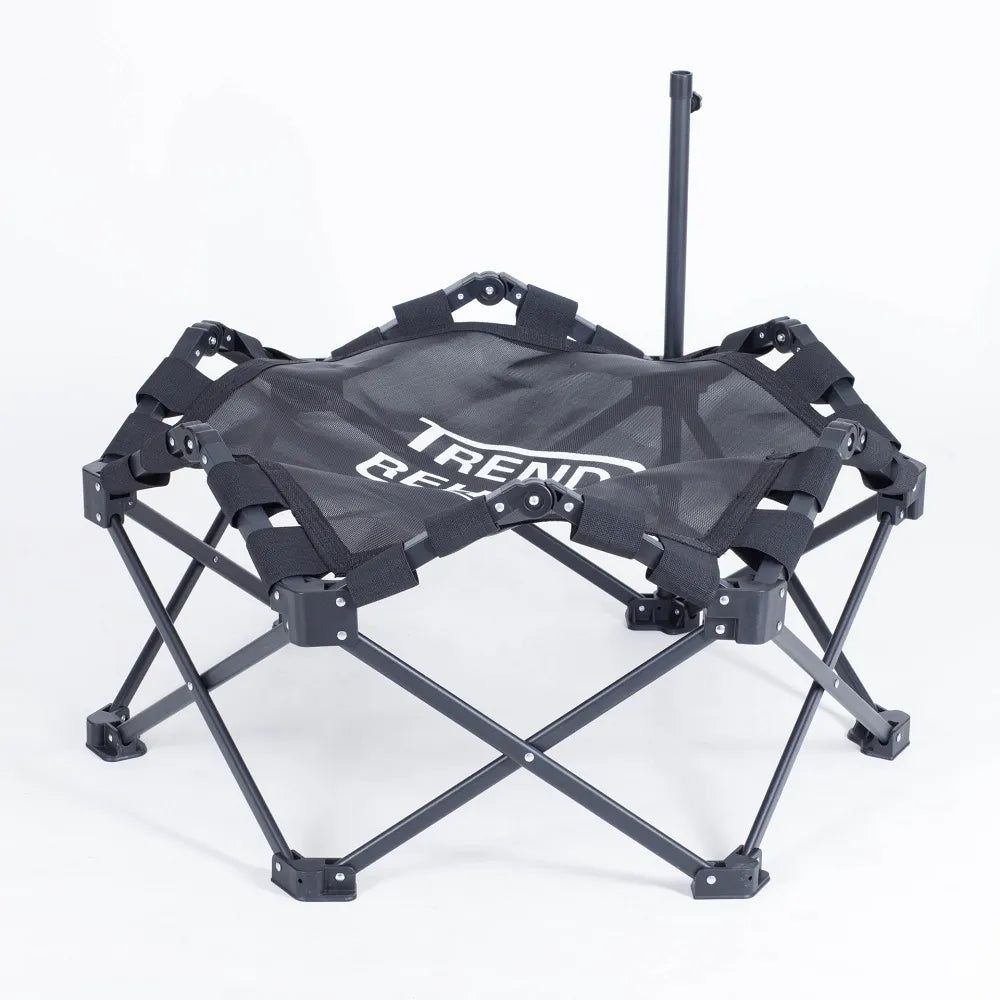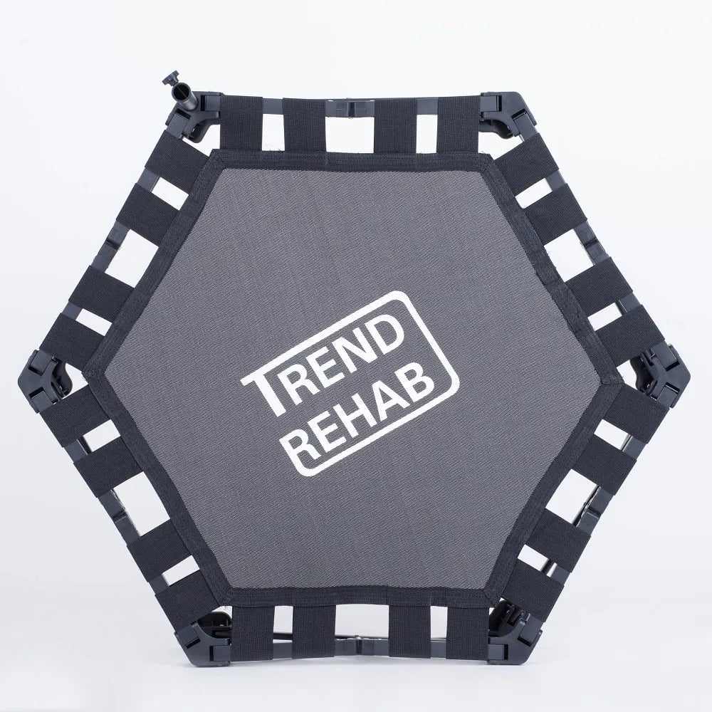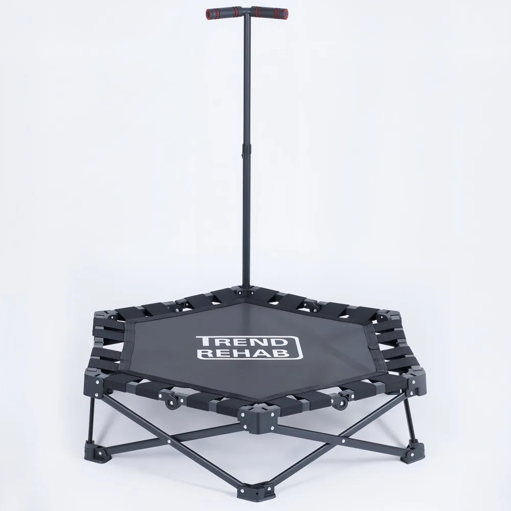 Spec: Hopfällbar studsmatta med 106 cm diameter och handtag. Enkel att förvara och ta med. Fälls ut som en stol – klar på sekunder. Inget verktyg behövs. Max användarvikt 130 kg.